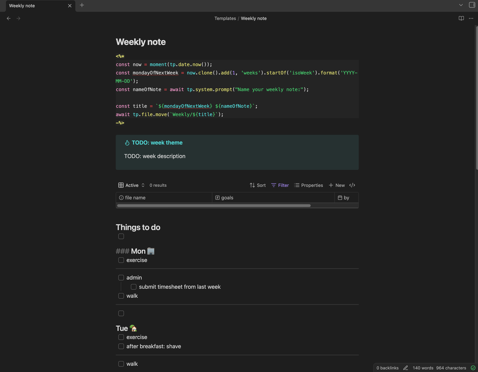 Right at the top, I'm using the Templater community plugin to include the date in YYYY-MM-DD format in my weekly notes, and move them automatically into the Weekly folder. It's great to be able to use my pre-existing programming skills to design my own custom workflow! But if you don't have those skills, you can just take the 30 seconds per week it would take to do manually, or use any number of other less-programmer-oriented plugins to achieve similar results.