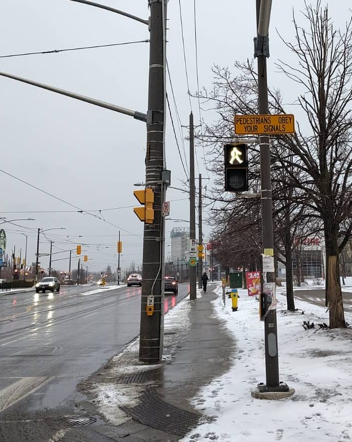 This particular sign also singles out one user group - the unfortunate pedestrian who must navigate this busy intersection. What about the cars, bicycles, streetcars, and busses that share use of the intersection with pedestrians? What about those with impaired mobility, who might well have difficulty crossing the street in the allotted time? The command reflects the history of jaywalking as an invented crime.